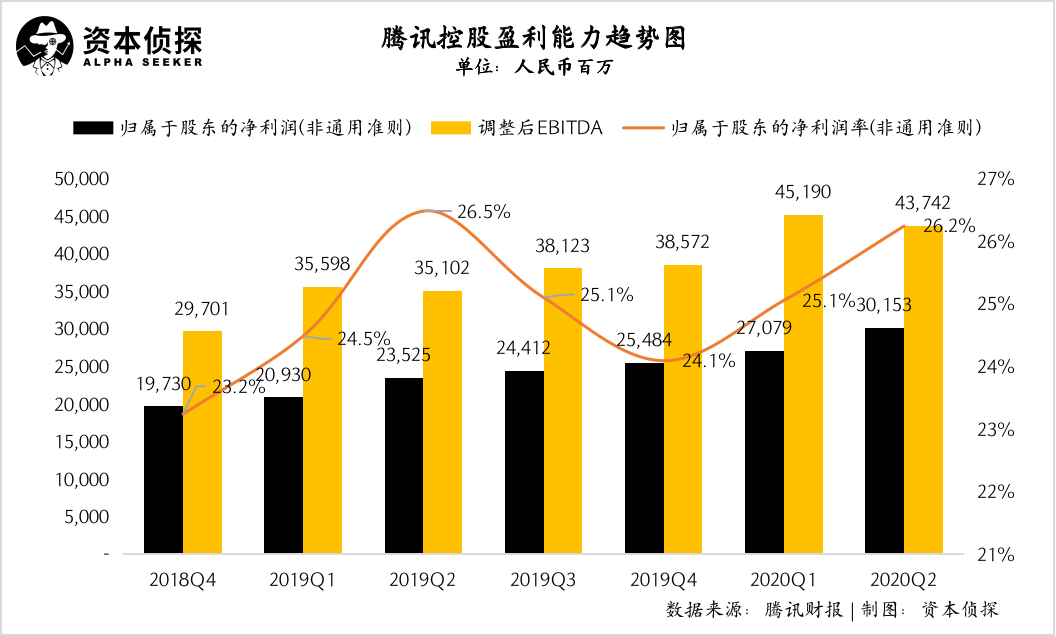 從財務表現可以看出,騰訊的盈利能力得到進一步優化。財報顯示,本季度騰訊調整后EBITDA為437.42億,歸屬于股東的凈利潤率連續三個季度呈上升趨勢,本季度達26.2%。