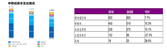 中國移動2020年資本開支計劃為人民幣1798億元,同比2019年資本支出大幅提高了8.38%;中國電信2020年計劃資本支出達850億,同比大幅提高9.6%;中國聯(lián)通2020年計劃資本支出達700億,同比大幅提高24.07%。可以從以上數(shù)據(jù)看出,隨著5G牌照的發(fā)放,中國的5G建設將會延續(xù)4G建設的周期和強度,在未來的3-5年內(nèi),以新基建中骨干力量的姿態(tài),撐起中國經(jīng)濟和中國電子信息行業(yè)的一面大旗。