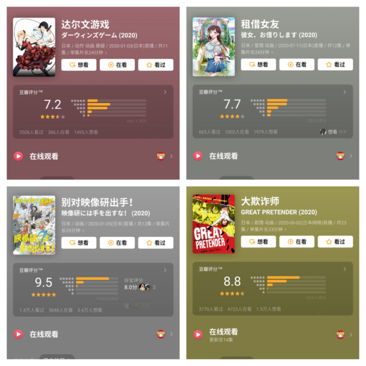 《達(dá)爾文游戲》(該番播放量破億),《大欺詐師》,《日本沉沒2020》、《租借女友》、《別對映像研出手》等等都在二次元圈內(nèi)、豆瓣上頗受好評。其中一部番劇很有戲劇性,《租借女友》起初在B站漫畫頻道熱度排名第三,動畫化之前B站也為此導(dǎo)流不少,但最后A站截胡,拿下動畫獨(dú)播權(quán),吸引了不少二次元用戶。