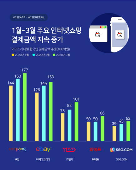 2020年4月,WiseApp公布了韓國第一季度線上購物預估交易額,數據顯示,2020年頭三個月Coupang的交易額均超過了eBay韓國。